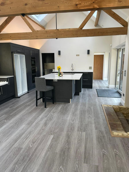 The renovation of the ground floor space of a converted barn property, including kitchen, utility, cloakroom and games room. Combining a new colour palette with a modern kitchen installation, underfloor heating and rewiring, and the creation of a games room space.